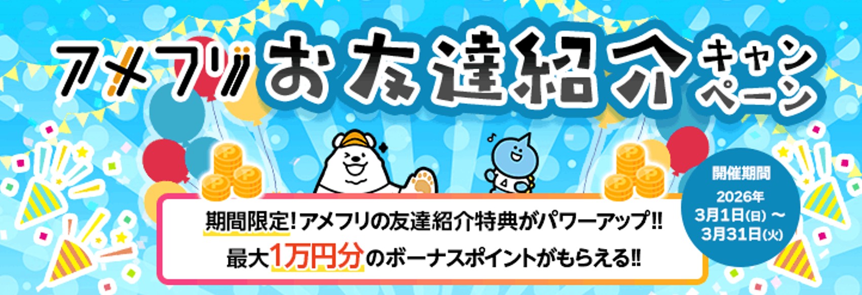 2026年3月1日(日)~ 3月31日(火)まで、アメフリの友達紹介制度のボーナスポイントで、最大10,000円分ptがもらえるキャンペーンを実施中です。