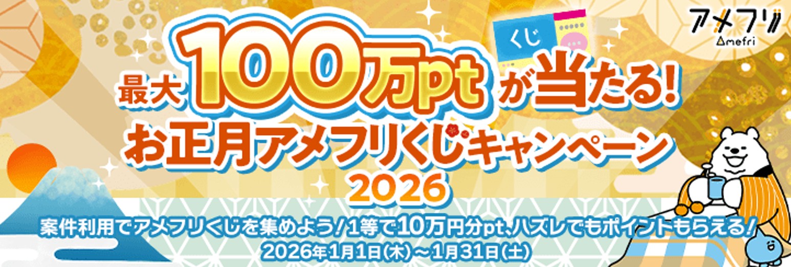 2026年1月1日(木) ~ 2026年1月31日(土)の期間中に、アメフリで広告案件に取り組むと、貯めたポイント5,000ptごとに1等最大10万円が当たるアメフリくじが「1枚」受け取れます。