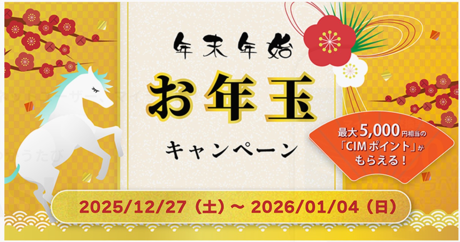 2025/12/27(土)00:00:00 〜 2026/01/04(日)23:59:59 までcimcome(コインカム)で最大5,000円相当のCIMポイントがもらえる年末年始お年玉キャンペーンを実施中です。