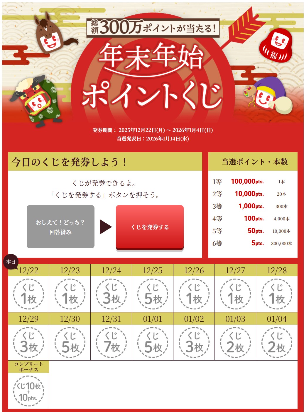また、期間中毎日欠かさずに発券した方は最終日2026年1月4日(日)に「毎日発券ボーナス10枚」を追加で発券、当選発表後1週間以内に コンプリートボーナスポイント10pts.が付与されます。